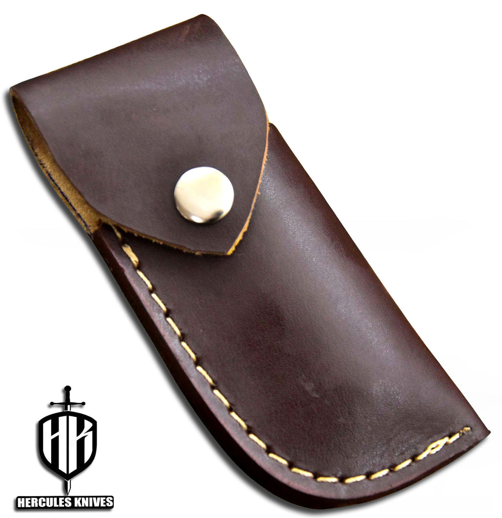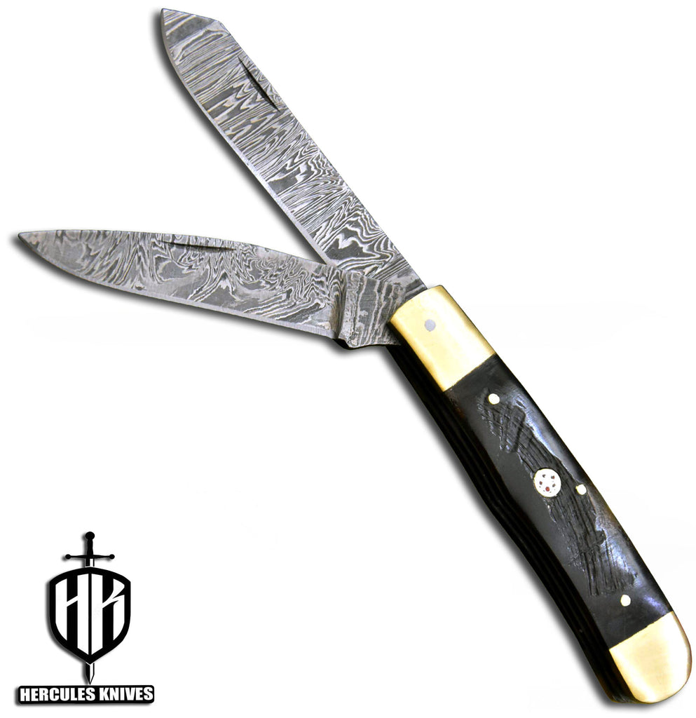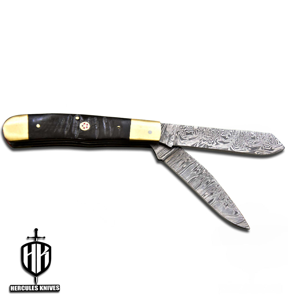 C553-EDC Pocket Folding Knife, Made of Custom Hand Forged Damascus Steel With Rams Horn Handle and Leather Sheath