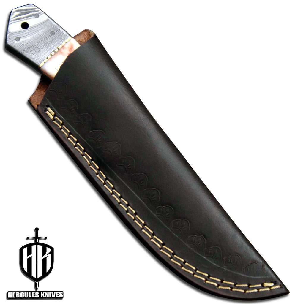 J644-Custom Hand Forged Damascus Steel Fixed Blade Camping Knife with Camel Bone Handle | Handmade | Leather Sheath